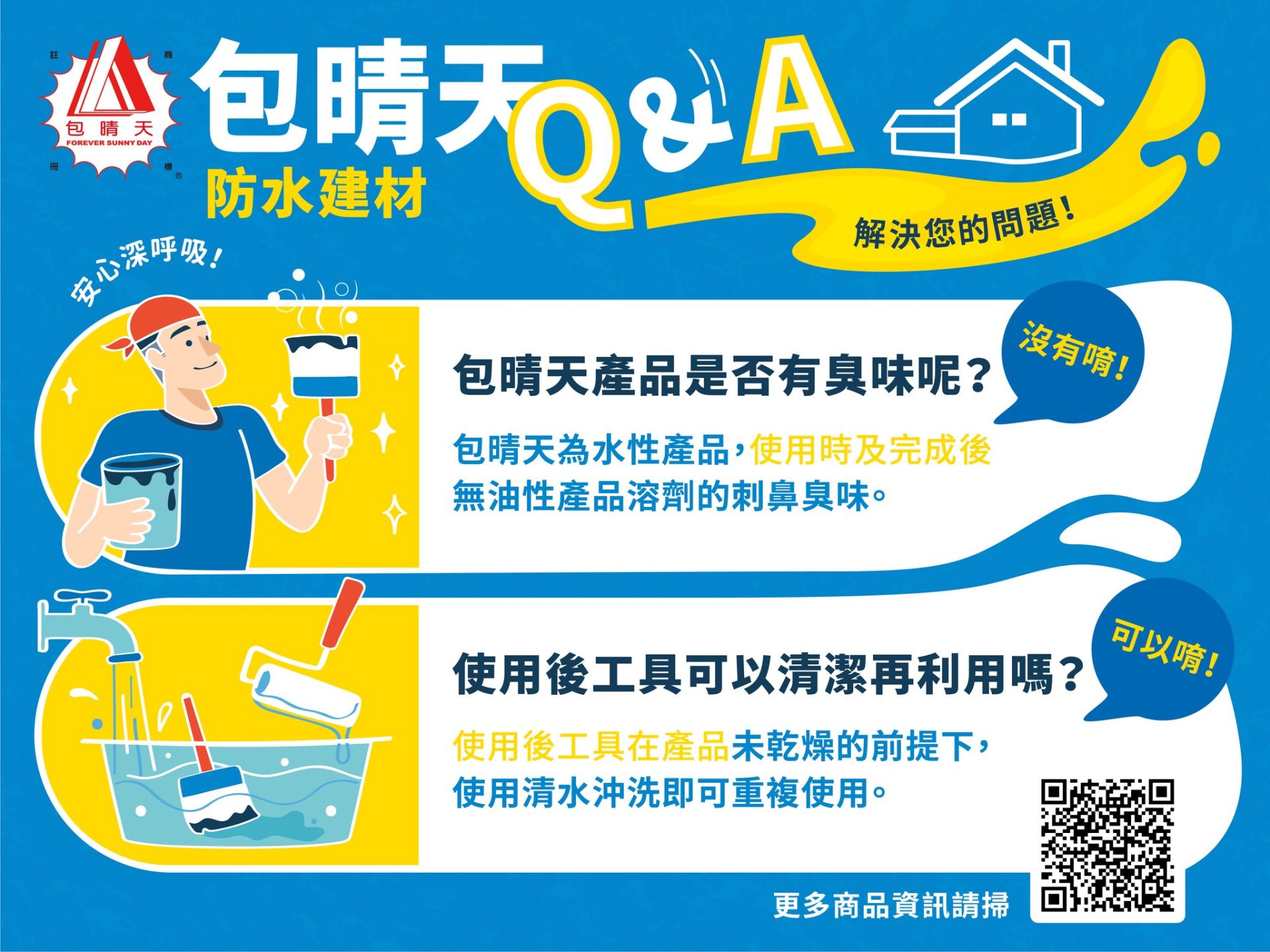 包晴天防水建材為皆為水性塗料,不僅沒有油性溶劑的刺鼻臭味,在塗料尚未乾燥的前提下,使用完的工具可直接以清水清洗後重複使用唷!