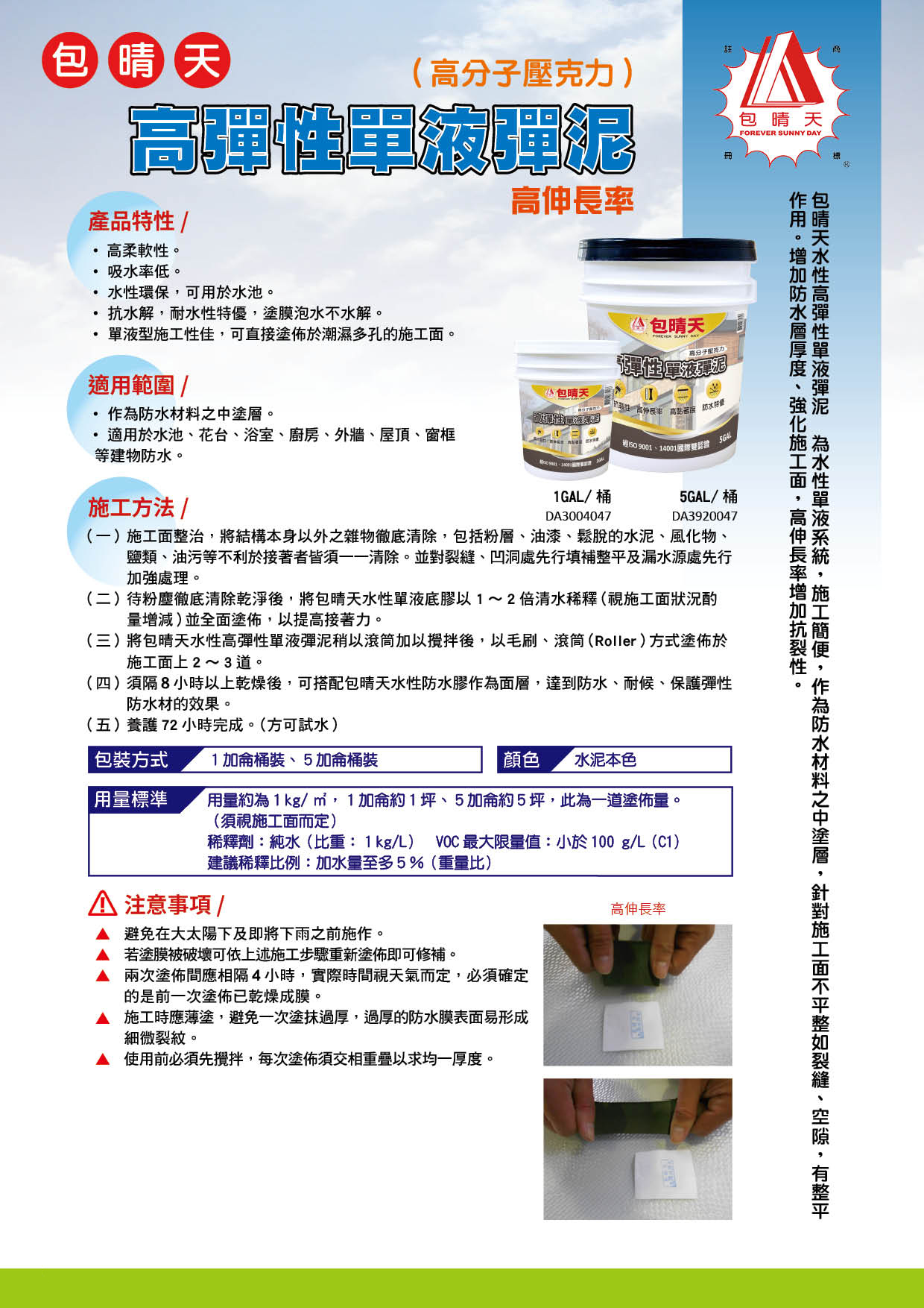 - (四)須隔8小時以上乾燥後,可搭配包晴天水性防水膠作為面層,達到防水、耐候、保護彈性防水材的效果。