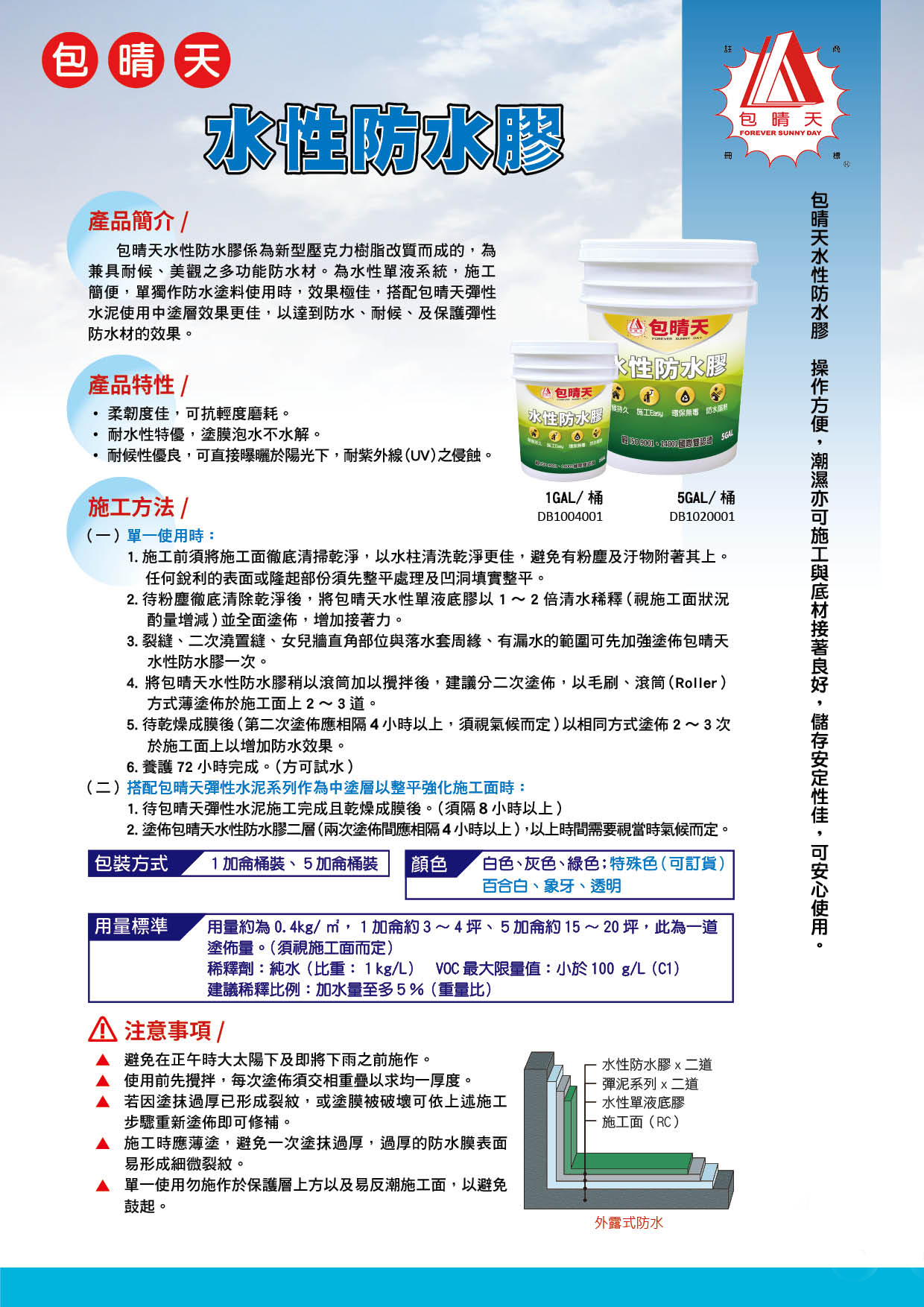包晴天水性防水膠係為新型壓克力樹脂改質而成的,為兼具耐候、美觀之多功能防水材。為水性單液系統,施工簡便,單獨作防水塗料使用時,效果極佳,搭配包晴天彈性水泥使用中塗層效果更佳,以達到防水、耐候、及保護彈性防水材的效果。