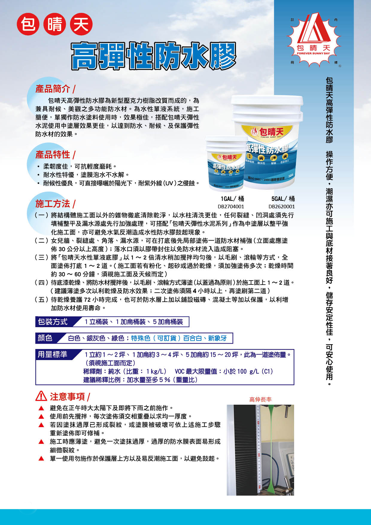 包晴天高彈性防水膠為新型壓克力樹脂改質而成的,為兼具耐候、美觀之多功能防水材。為水性單液系統,施工簡便,單獨作防水塗料使用時,效果極佳,搭配包晴天彈性水泥使用中塗層效果更佳,以達到防水、耐候、及保護彈性防水材的效果。