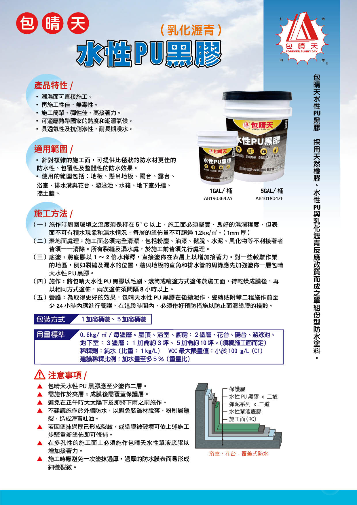 - 包晴天水性PU黑膠應至少塗佈二層。