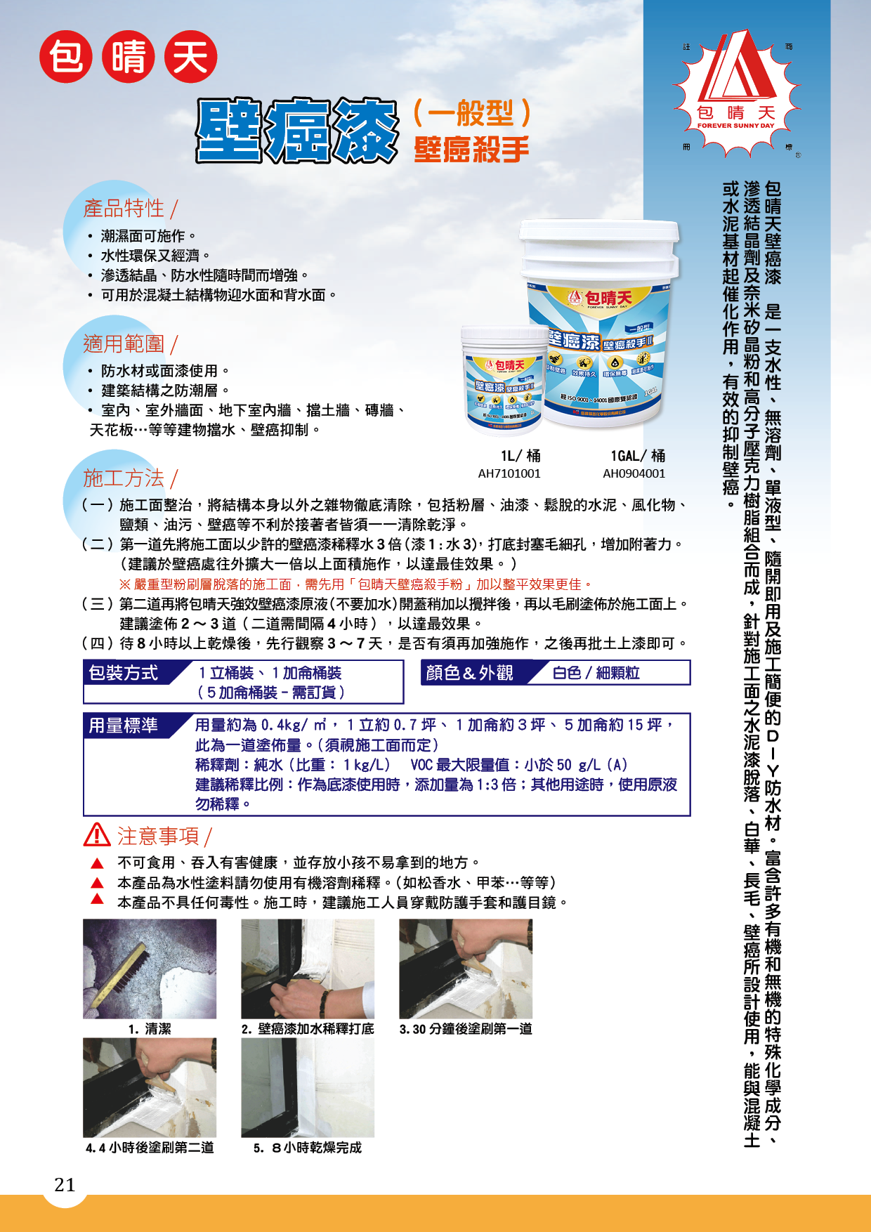 - 室內、室外牆面、地下室內牆、擋土牆、磚牆、天花板…等等建物擋水、壁癌抑制。