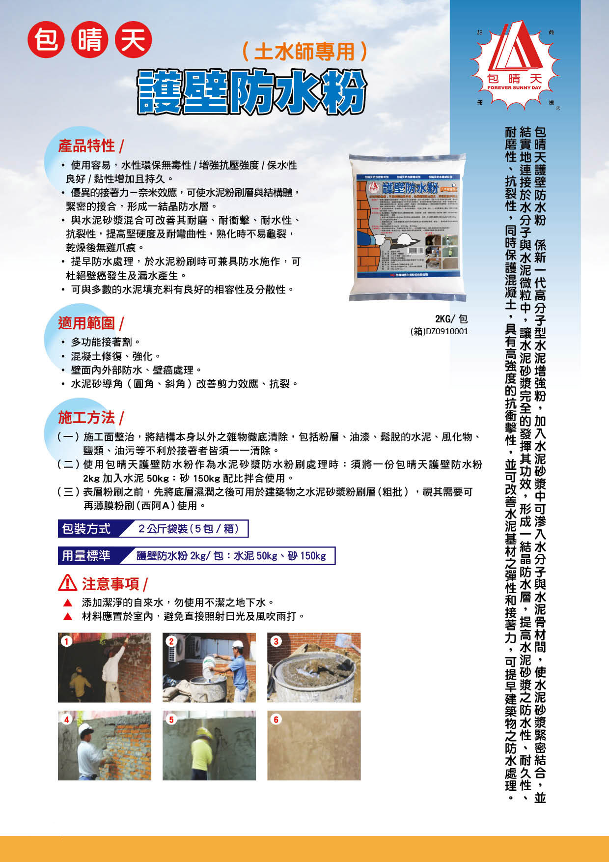 包晴天護壁防水粉 係新一代高分子型水泥增強粉,加入水泥砂漿中可滲入水分子與水泥骨材間,使水泥砂漿緊密結合,並結實地連接於水分子與水泥微粒中,讓水泥砂漿完全的發揮其功效,形成一結晶防水層,提高水泥砂漿之防水性、耐久性、耐磨性、抗裂性,同時保護混凝土,具有高強度的抗衝擊性,並可改善水泥基材之彈性和接著力,可提早建築物之防水處理。