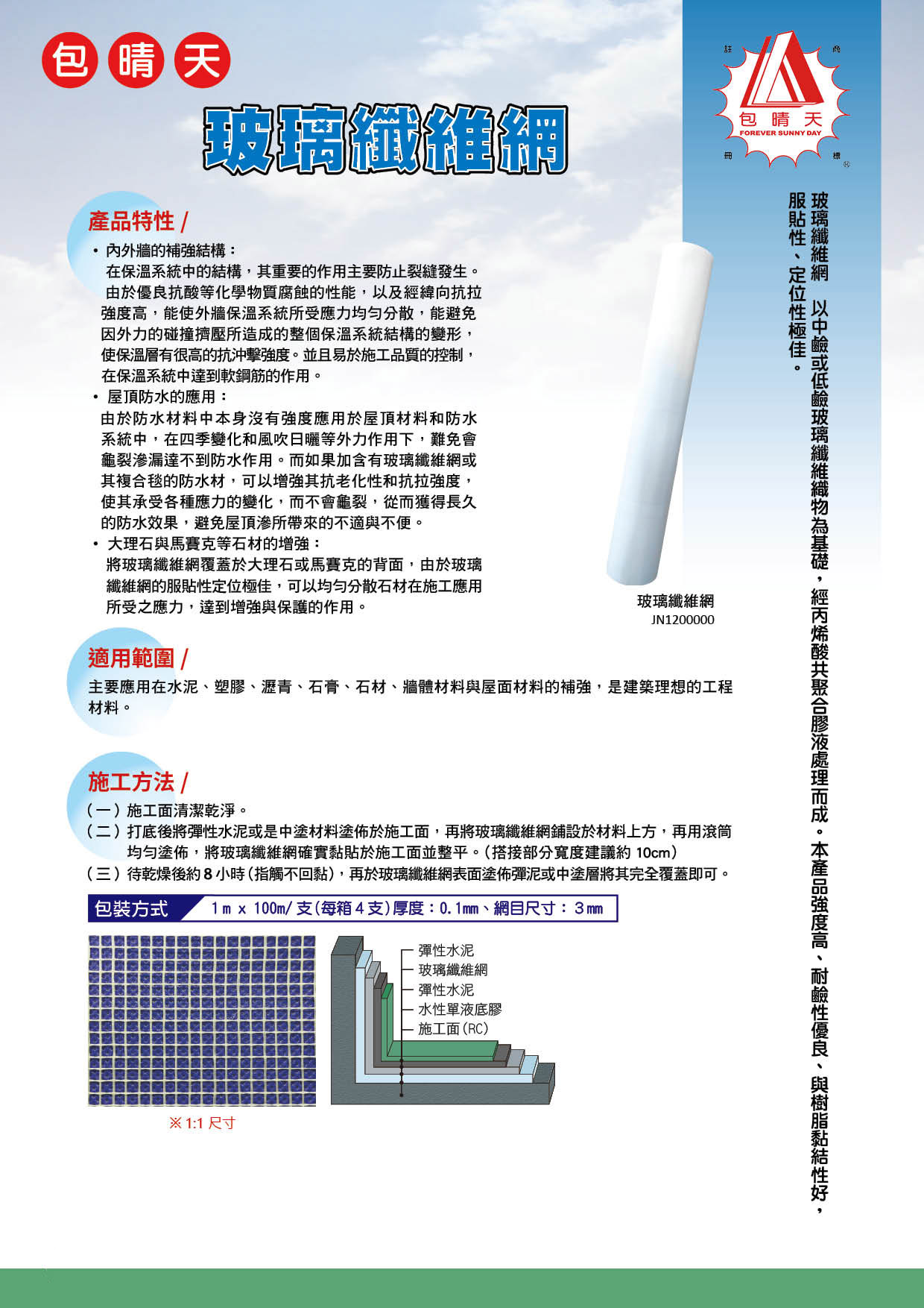 由於防水材料中本身沒有強度應用於屋頂材料和防水系統中,在四季變化和風吹日曬等外力作用下,難免會龜裂滲漏達不到防水作用。而如果加含有玻璃纖維網或 其複合毯的防水材,可以增強其抗老化性和抗拉強度, 使其承受各種應力的變化,而不會龜裂,從而獲得長久 的防水效果,避免屋頂滲所帶來的不適與不便。