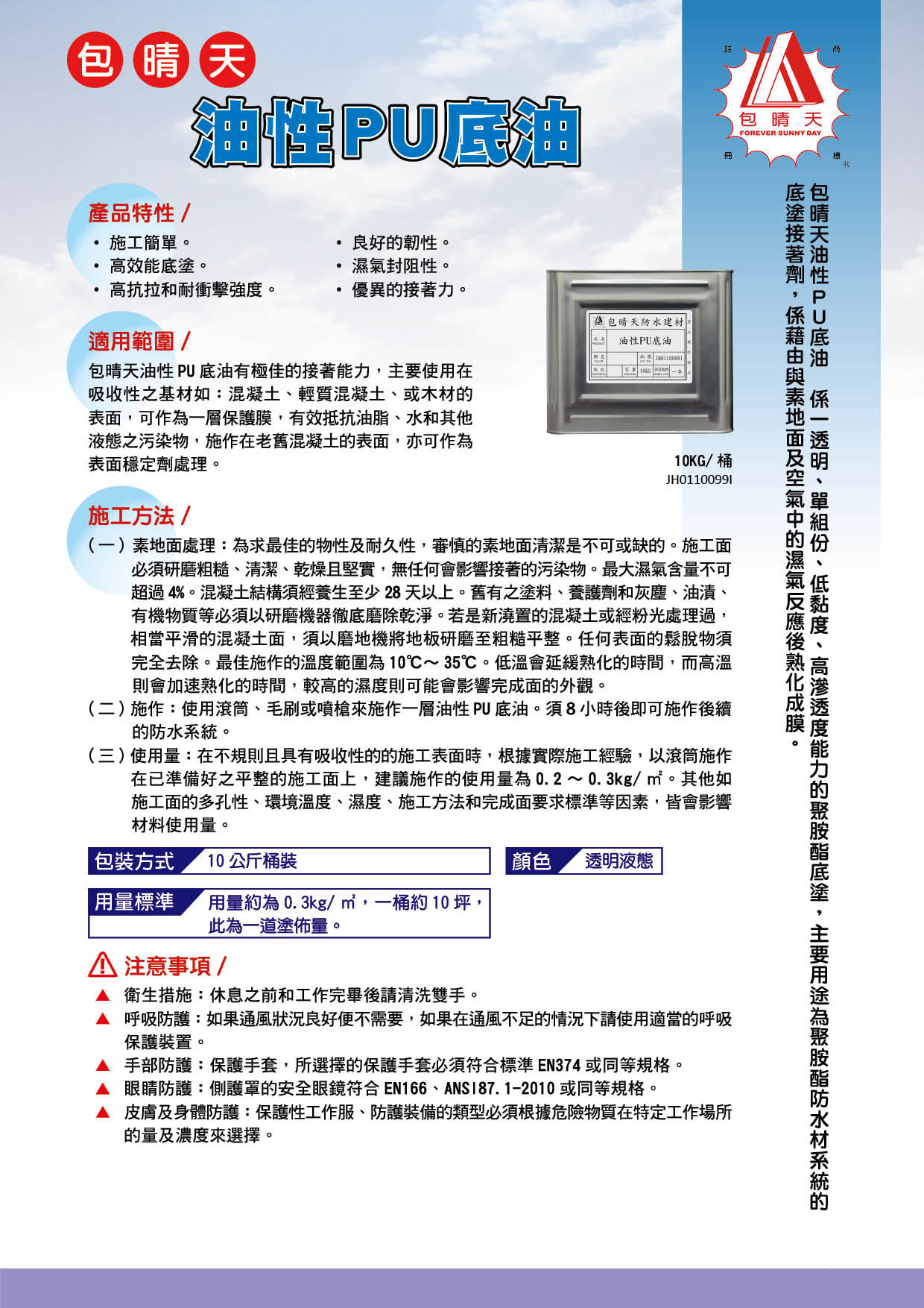 - 包晴天油性PU底油有極佳的接著能力,主要使用在吸收性之基材如:混凝土、輕質混凝土、或木材的表面,可作為一層保護膜,有效抵抗油脂、水和其他液態之污染物,施作在老舊混凝土的表面,亦可作為表面穩定劑處理。