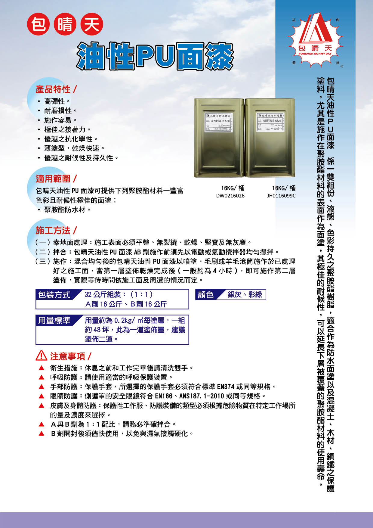 包晴天油性PU面漆可提供下列聚胺酯材料一豐富色彩且耐候性極佳的面塗: