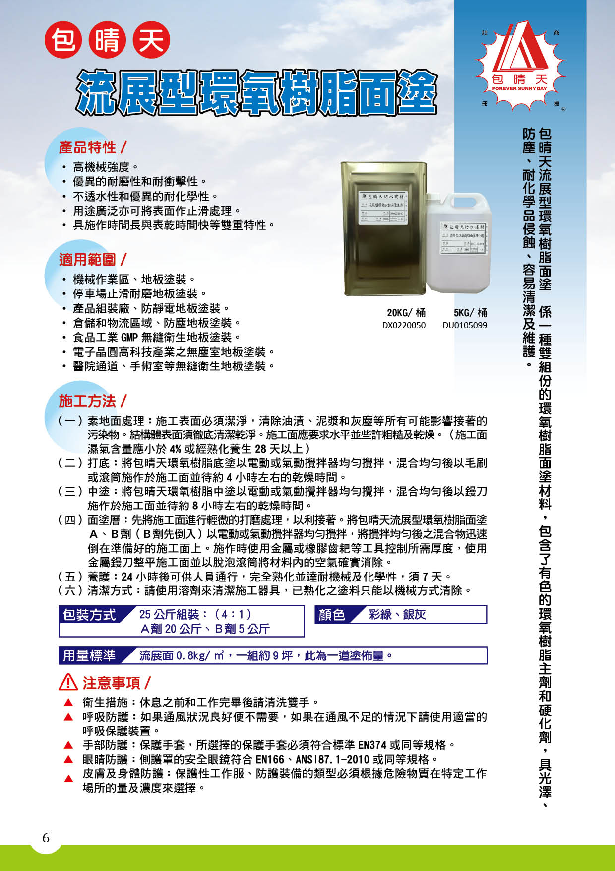 - (四)面塗層:先將施工面進行輕微的打磨處理,以利接著。將包晴天流展型環氧樹脂面塗A、B劑(B劑先倒入)以電動或氣動攪拌器均勻攪拌,將攪拌均勻後之混合物迅速倒在準備好的施工面上。施作時使用金屬或橡膠齒耙等工具控制所需厚度,使用金屬鏝刀整平施工面並以脫泡滾筒將材料內的空氣確實消除。