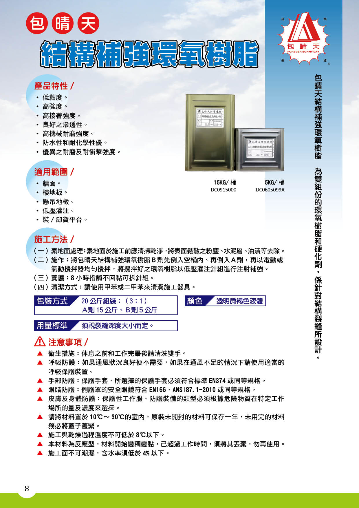 包晴天結構補強環氧樹脂 為雙組份的環氧樹脂和硬化劑,係針對結構裂縫所設計。