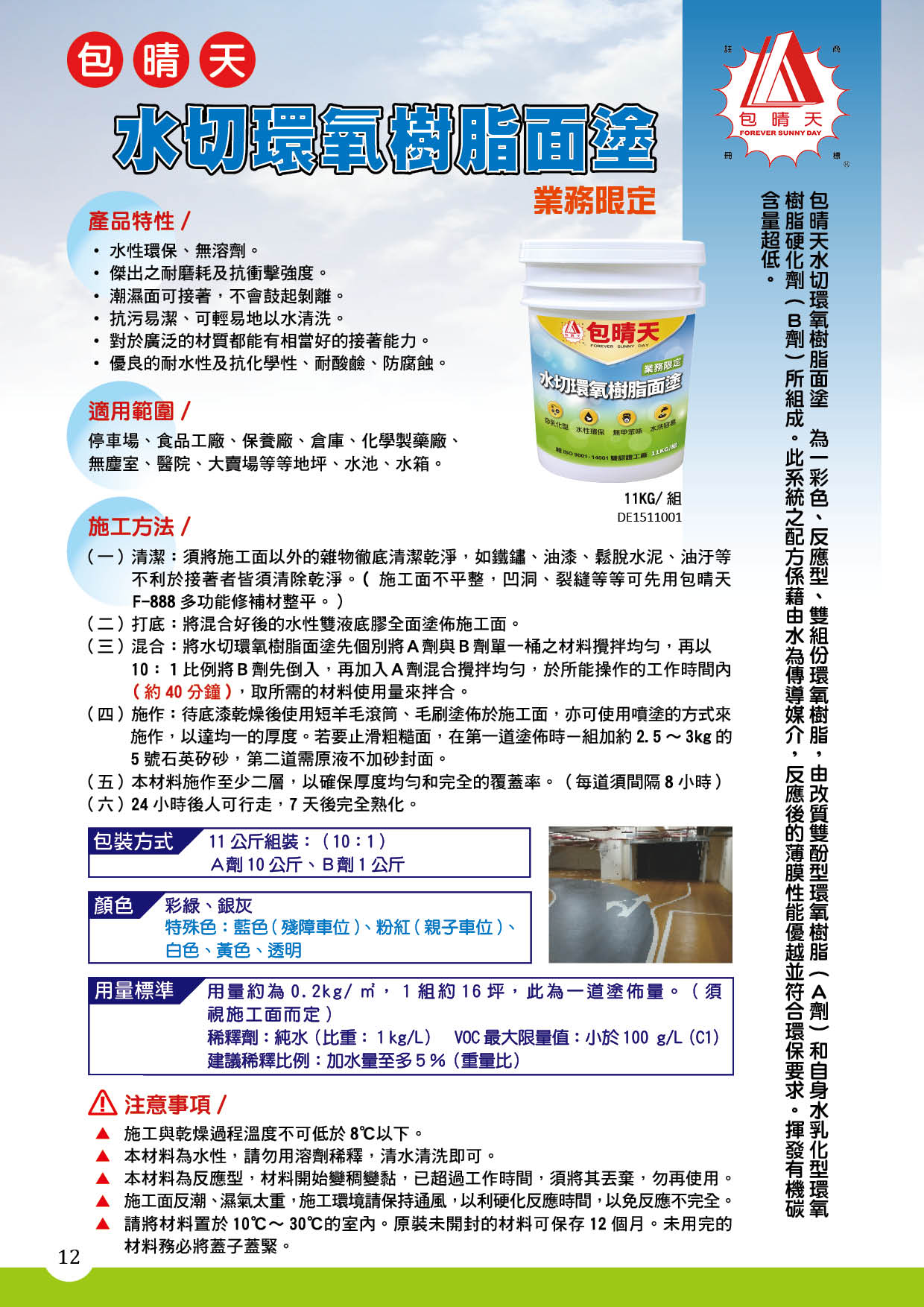 - 施工面反潮、濕氣太重,施工環境請保持通風,以利硬化反應時間,以免反應不完全。