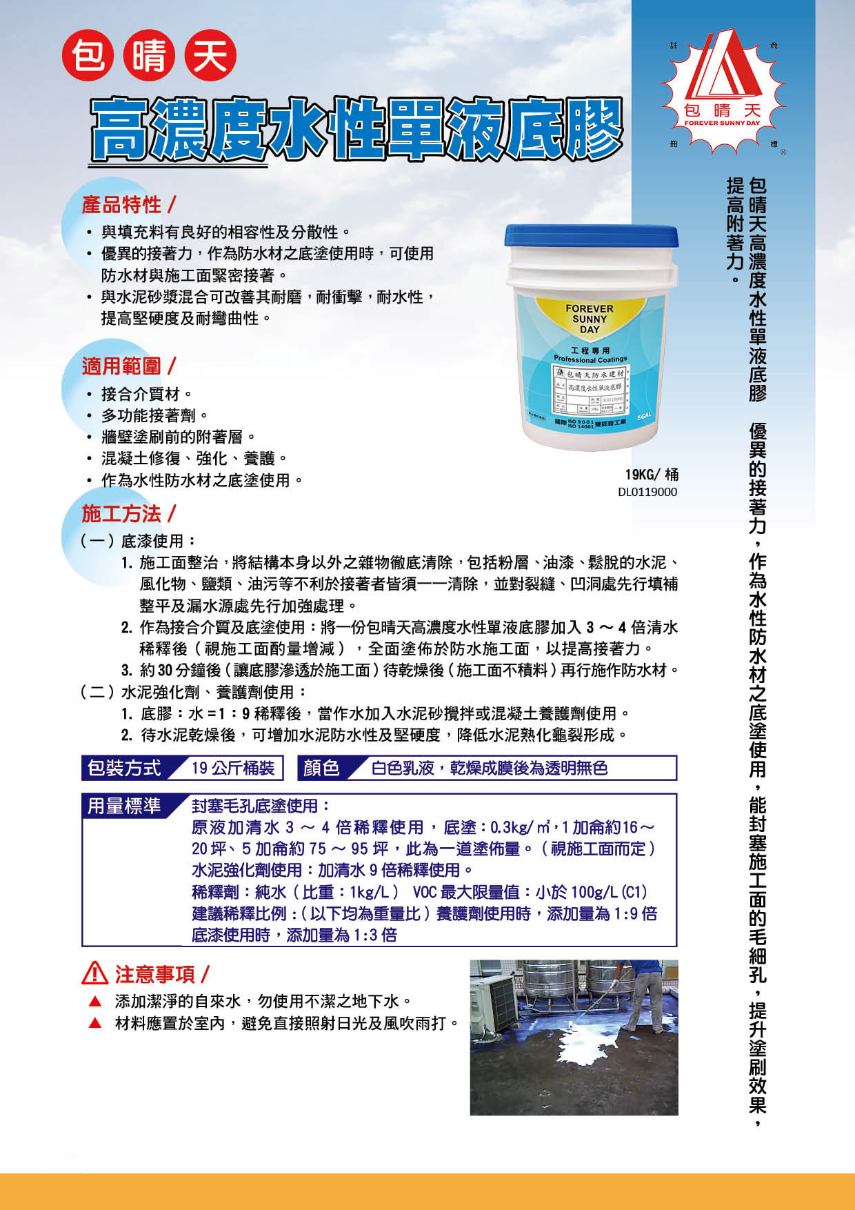 包晴天高濃度水性單液底膠 優異的接著力,作為水性防水材之底塗使用,能封塞施工面的毛細孔,提升塗刷效果,提高附著力。