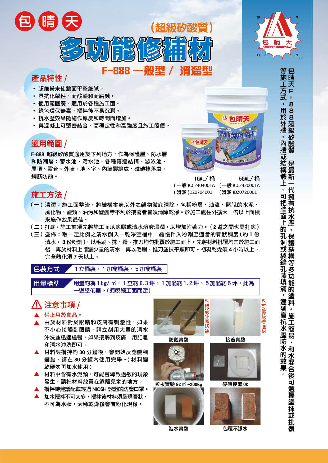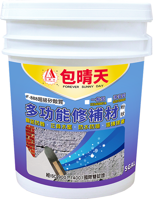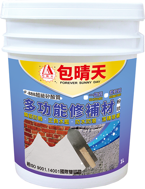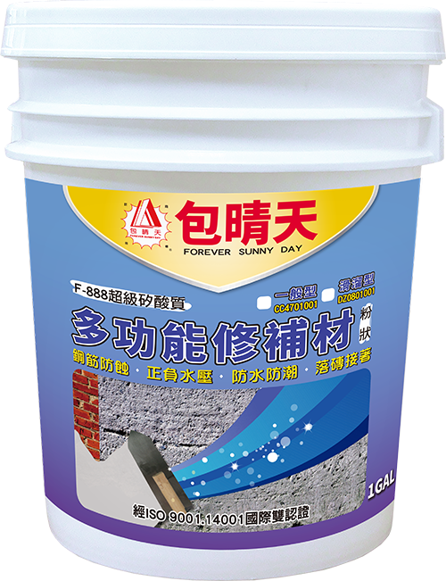 - F-888 超級矽酸質適用於下列地方,作為保護層、防水層和防潮層:蓄水池、污水池、各種磚牆結構、游泳池、屋頂、露台、外牆、地下室、內牆裂縫處、磁磚掉落處、鋼筋防蝕。
