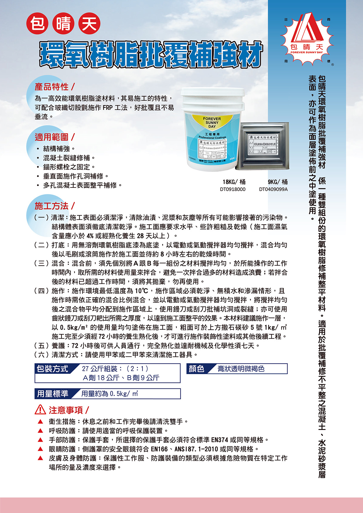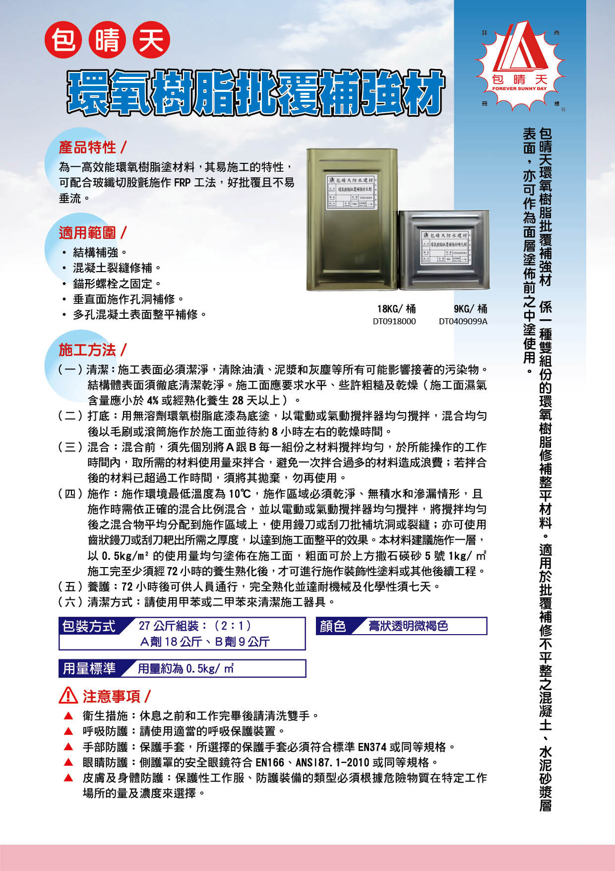 包晴天環氧樹脂批覆補強材 係一種雙組份的環氧樹脂修補整平材料。適用於批覆補修不平整之混凝土、水泥砂漿層表面,亦可作為面層塗佈前之中塗使用。